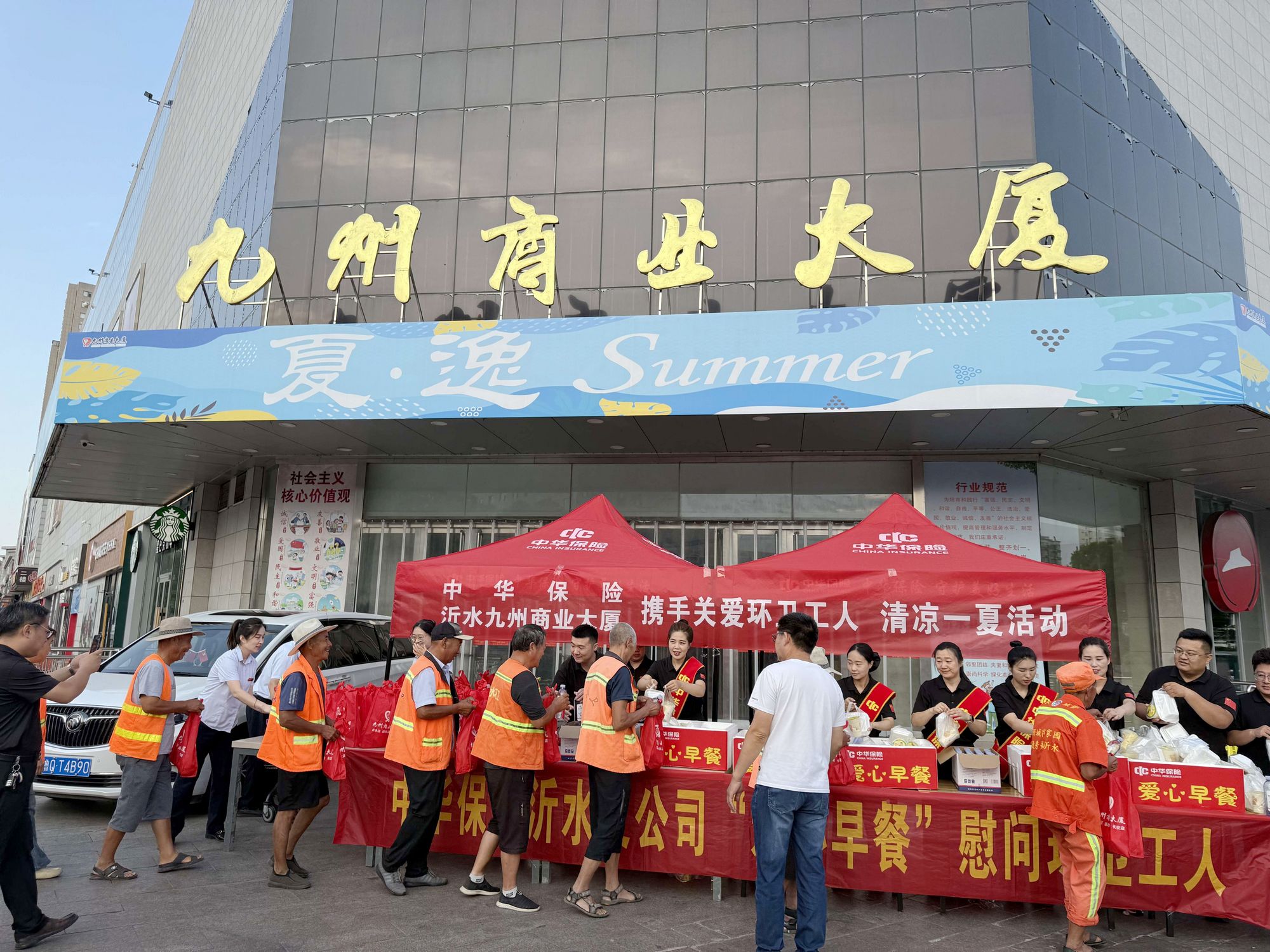 7月15日早上,九州商業(yè)大廈沂水門店攜手中華保險公司,在長安店門前廣場聯(lián)合開展了“攜手關(guān)愛環(huán)衛(wèi)工人 清涼一夏”公益活動,為150余名一線環(huán)衛(wèi)工人發(fā)放早餐與清涼禮包,在炎炎夏日為城市的“美容師”送去清涼與關(guān)懷。