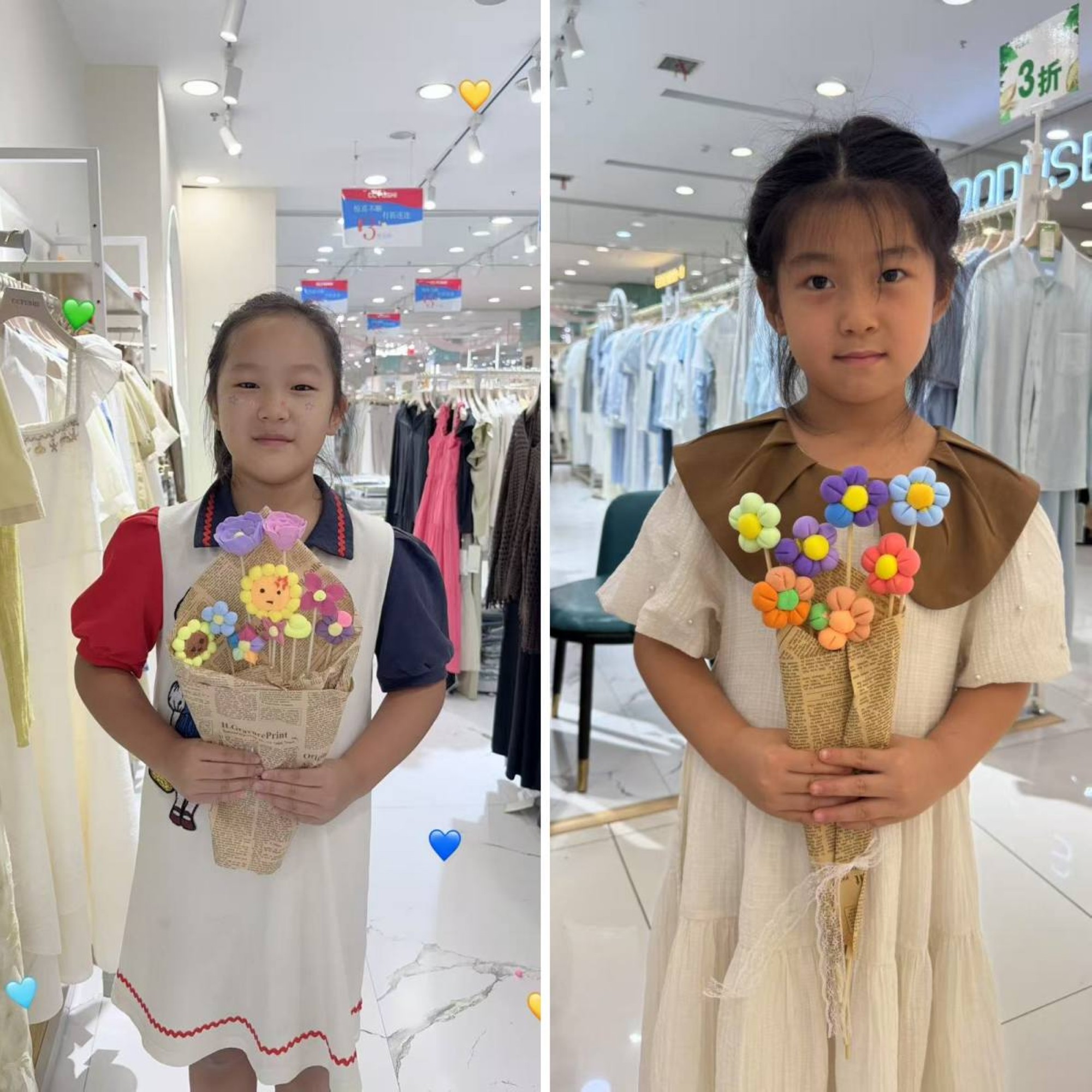 活動現(xiàn)場, CGFUSHI 女裝店長孫良梅化身 “藝術(shù)導(dǎo)師”,從基礎(chǔ)花瓣揉制到花莖拼接技巧,再到花葉搭配與整體包裝, 逐步拆解粘土花束的制作要點(diǎn)。到場家長與孩子攜手協(xié)作,揉、捏、粘、貼間,原本普通的粘土逐漸蛻變,一朵朵 “永不凋謝”的粘土花朵在親子默契配合下成型,組合為獨(dú)具心意的花束,猶如孩子們的臉龐,燦爛又美麗。