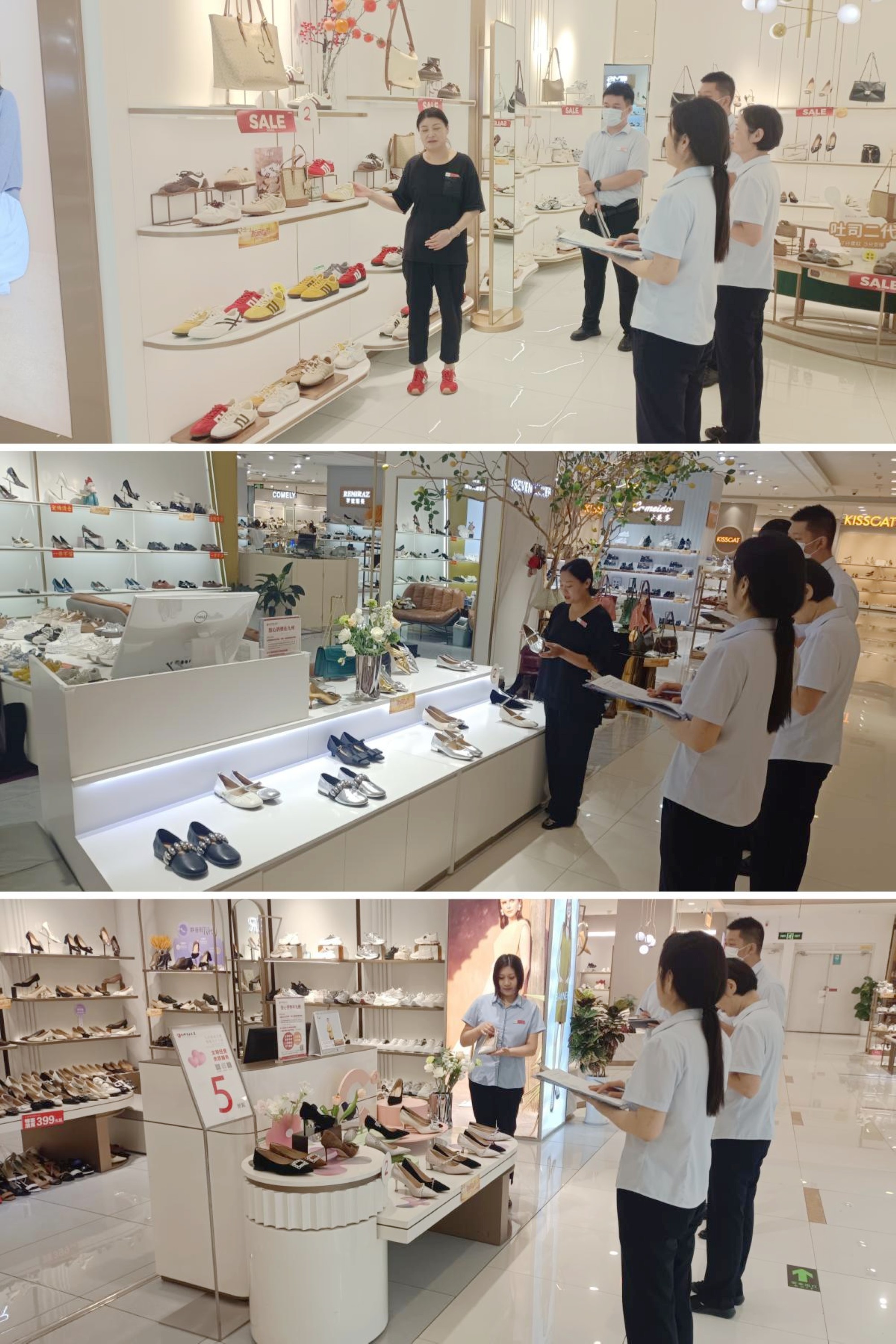 比賽現(xiàn)場,員工各展所長,圍繞秋日主題,結(jié)合女鞋的款式、色彩等特點,精心構(gòu)造陳列方案。有的打造出秋日氛圍感的穿搭陳列,將女鞋與帽子、包包、襪子等巧妙搭配,有的則通過錯落有致的擺放,凸顯女鞋的時尚設(shè)計與舒適質(zhì)感。9名評委根據(jù)色彩搭配、創(chuàng)意解說、陳列賣點等環(huán)節(jié)評分,最終,愛步專柜郭學(xué)芳以“浪漫七夕—炫彩秋日山系風(fēng)系列”摘得桂冠;七號買手專柜洪云的“秋日復(fù)古新潮—中國風(fēng)系列”陳列和莎莎蘇專柜吳淑娟的“繽紛秋日—紅色浪漫系列”陳列榮獲二等獎;接吻貓專柜郭才紅的“秋日光陰的溫度—瑪麗珍系列”陳列、百麗專柜武慶嬌的“秋日奔走—德訓(xùn)旅程系列”陳列和千百度專柜王長玉的“秋日浪漫—慕斯舒軟系列”陳列榮獲三等獎;康莉?qū)9窕好返任迕麊T工榮獲優(yōu)秀獎。